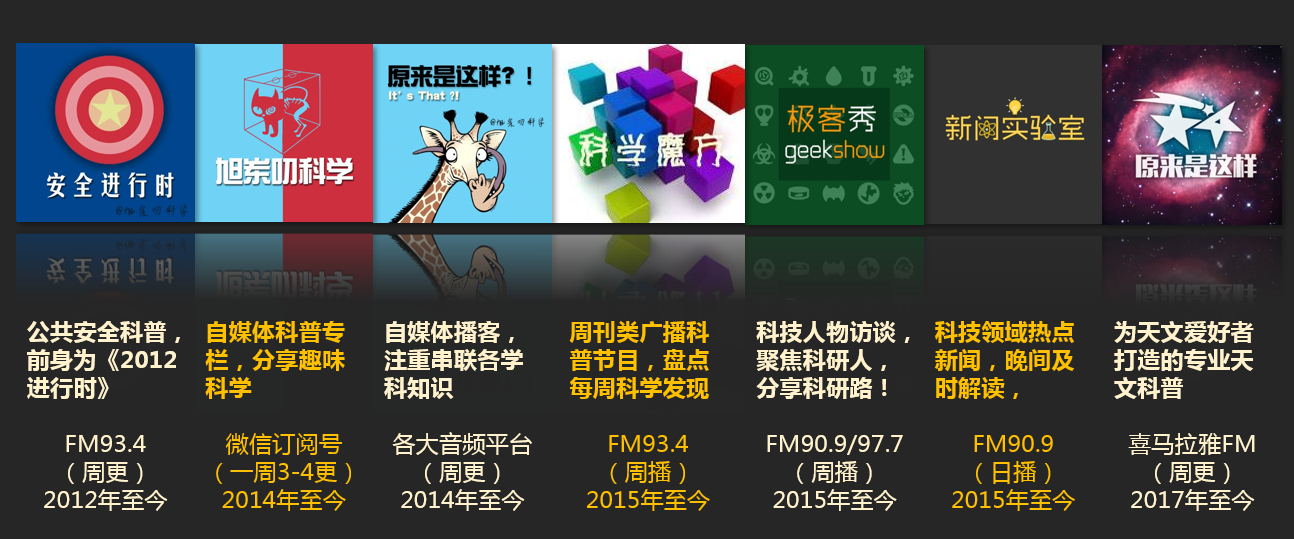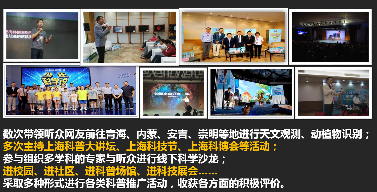 累计主持的广播科普节目时长已超过2000小时,访谈科研、科普、技术类工作者数百人,主持各类线下科普活动百余次,撰写的科普节目文案已超过200万字。