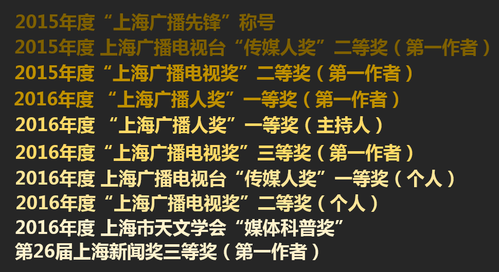 个人及主持作品多次获得上海新闻奖、广电奖、传媒人奖、广播人奖、上海广播先锋称号等,获得广电业界的充分肯定。